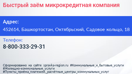 Быстрый заём, микрокредитная компания по адресу 452614, Башкортостан, Октябрьский, Садовое кольцо, 18 в дальнейшем Организация, размещена в следующих категориях:
