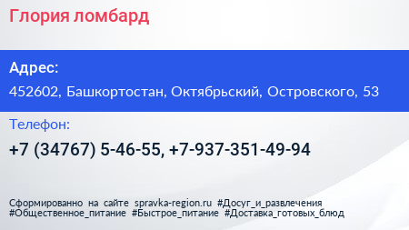 Глория, ломбард по адресу 452602, Башкортостан, Октябрьский, Островского, 53 в дальнейшем Организация, размещена в следующих категориях: