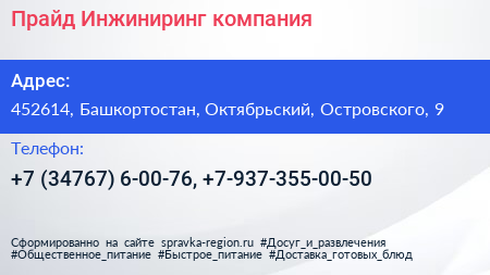 Прайд Инжиниринг, компания по адресу 452614, Башкортостан, Октябрьский, Островского, 9 в дальнейшем Организация, размещена в следующих категориях: