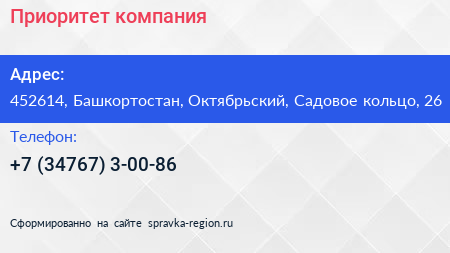 Приоритет, компания по адресу 452614, Башкортостан, Октябрьский, Садовое кольцо, 26 в дальнейшем Организация, размещена в следующих категориях: