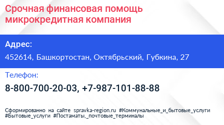 Срочная финансовая помощь, микрокредитная компания по адресу 452614, Башкортостан, Октябрьский, Губкина, 27 в дальнейшем Организация, размещена в следующих категориях: