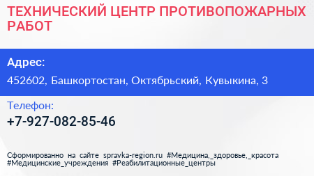 ТЕХНИЧЕСКИЙ ЦЕНТР ПРОТИВОПОЖАРНЫХ РАБОТ по адресу 452602, Башкортостан, Октябрьский, Кувыкина, 3 в дальнейшем Организация, размещена в следующих категориях: