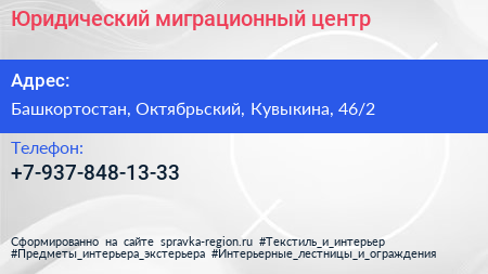 Юридический миграционный центр по адресу Башкортостан, Октябрьский, Кувыкина, 46/2 в дальнейшем Организация, размещена в следующих категориях: