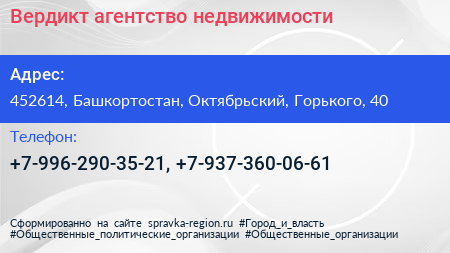 Вердикт, агентство недвижимости по адресу 452614, Башкортостан, Октябрьский, Горького, 40 в дальнейшем Организация, размещена в следующих категориях: