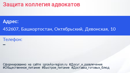 Защита, коллегия адвокатов по адресу 452607, Башкортостан, Октябрьский, Девонская, 10 в дальнейшем Организация, размещена в следующих категориях:
