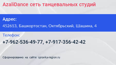 AzaliDance, сеть танцевальных студий по адресу 452613, Башкортостан, Октябрьский, Шашина, 4 в дальнейшем Организация, размещена в следующих категориях: