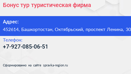 Бонус-тур, туристическая фирма по адресу 452614, Башкортостан, Октябрьский, проспект Ленина, 30 в дальнейшем Организация, размещена в следующих категориях: