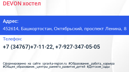 DEVON, хостел по адресу 452614, Башкортостан, Октябрьский, проспект Ленина, 8 в дальнейшем Организация, размещена в следующих категориях: