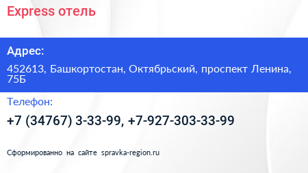 Express, отель по адресу 452613, Башкортостан, Октябрьский, проспект Ленина, 75Б в дальнейшем Организация, размещена в следующих категориях: