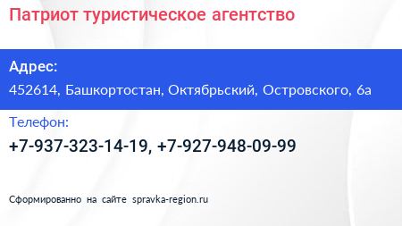 Патриот, туристическое агентство по адресу 452614, Башкортостан, Октябрьский, Островского, 6а в дальнейшем Организация, размещена в следующих категориях: