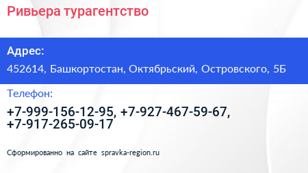 Ривьера, турагентство по адресу 452614, Башкортостан, Октябрьский, Островского, 5Б в дальнейшем Организация, размещена в следующих категориях: