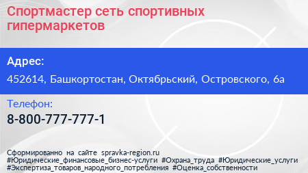 Спортмастер, сеть спортивных гипермаркетов по адресу 452614, Башкортостан, Октябрьский, Островского, 6а в дальнейшем Организация, размещена в следующих категориях: