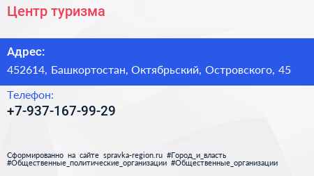 Центр туризма по адресу 452614, Башкортостан, Октябрьский, Островского, 45 в дальнейшем Организация, размещена в следующих категориях: