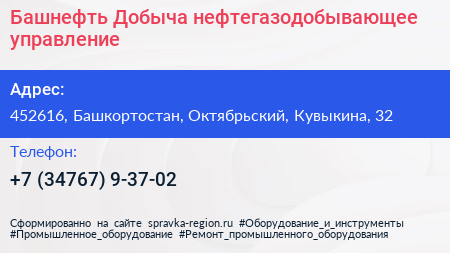 Башнефть-Добыча, нефтегазодобывающее управление по адресу 452616, Башкортостан, Октябрьский, Кувыкина, 32 в дальнейшем Организация, размещена в следующих категориях: