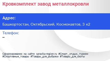 Кровкомплект, завод металлокровли по адресу Башкортостан, Октябрьский, Космонавтов, 3 к2 в дальнейшем Организация, размещена в следующих категориях: