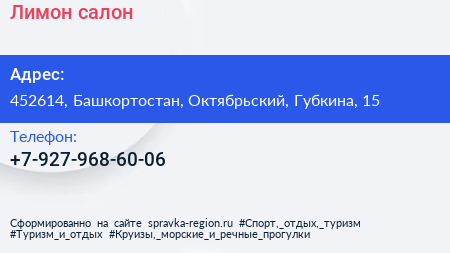 Лимон, салон по адресу 452614, Башкортостан, Октябрьский, Губкина, 15 в дальнейшем Организация, размещена в следующих категориях: