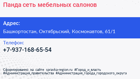 Панда, сеть мебельных салонов по адресу Башкортостан, Октябрьский, Космонавтов, 61/1 в дальнейшем Организация, размещена в следующих категориях: