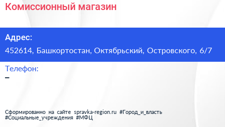 Комиссионный магазин по адресу 452614, Башкортостан, Октябрьский, Островского, 6/7 в дальнейшем Организация, размещена в следующих категориях:
