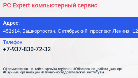 PC Expert, компьютерный сервис по адресу 452614, Башкортостан, Октябрьский, проспект Ленина, 12 в дальнейшем Организация, размещена в следующих категориях: