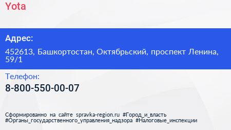 Yota по адресу 452613, Башкортостан, Октябрьский, проспект Ленина, 59/1 в дальнейшем Организация, размещена в следующих категориях:
