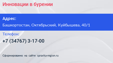 Инновации в бурении по адресу Башкортостан, Октябрьский, Куйбышева, 40/1 в дальнейшем Организация, размещена в следующих категориях: