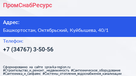 ПромСнабРесурс по адресу Башкортостан, Октябрьский, Куйбышева, 40/1 в дальнейшем Организация, размещена в следующих категориях: