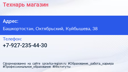 Технарь, магазин по адресу Башкортостан, Октябрьский, Куйбышева, 38 в дальнейшем Организация, размещена в следующих категориях: