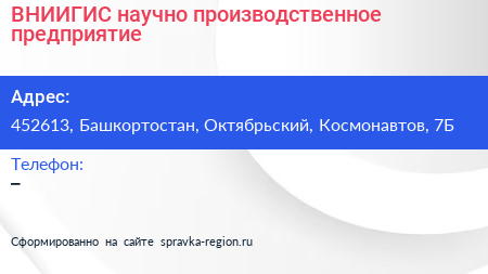 ВНИИГИС, научно-производственное предприятие по адресу 452613, Башкортостан, Октябрьский, Космонавтов, 7Б в дальнейшем Организация, размещена в следующих категориях: