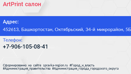 ArtPrint, салон по адресу 452613, Башкортостан, Октябрьский, 34-й микрорайон, 5Б в дальнейшем Организация, размещена в следующих категориях: