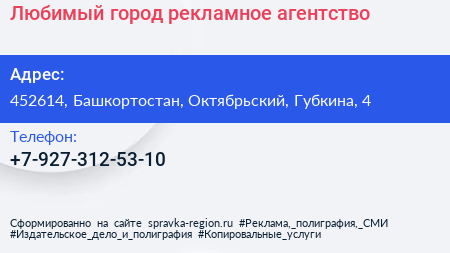 Любимый город, рекламное агентство по адресу 452614, Башкортостан, Октябрьский, Губкина, 4 в дальнейшем Организация, размещена в следующих категориях: