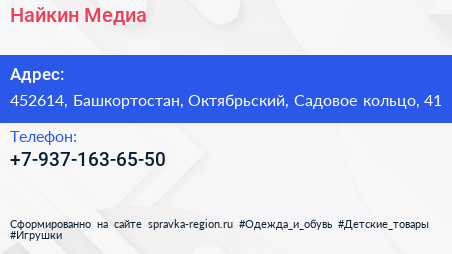 Найкин Медиа по адресу 452614, Башкортостан, Октябрьский, Садовое кольцо, 41 в дальнейшем Организация, размещена в следующих категориях: