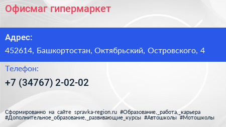 Офисмаг, гипермаркет по адресу 452614, Башкортостан, Октябрьский, Островского, 4 в дальнейшем Организация, размещена в следующих категориях: