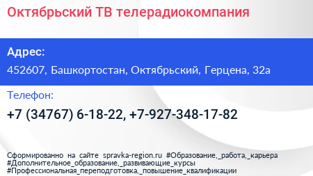 Октябрьский-ТВ, телерадиокомпания по адресу 452607, Башкортостан, Октябрьский, Герцена, 32а в дальнейшем Организация, размещена в следующих категориях:
