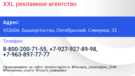 XXL, рекламное агентство по адресу 452606, Башкортостан, Октябрьский, Северная, 31 в дальнейшем Организация, размещена в следующих категориях: