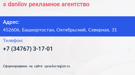 s.danilov, рекламное агентство по адресу 452606, Башкортостан, Октябрьский, Северная, 31 в дальнейшем Организация, размещена в следующих категориях: