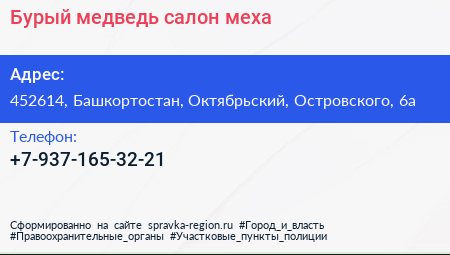 Бурый медведь, салон меха по адресу 452614, Башкортостан, Октябрьский, Островского, 6а в дальнейшем Организация, размещена в следующих категориях: