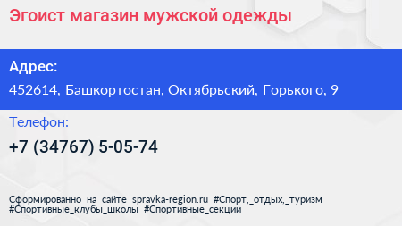 Эгоист, магазин мужской одежды по адресу 452614, Башкортостан, Октябрьский, Горького, 9 в дальнейшем Организация, размещена в следующих категориях: