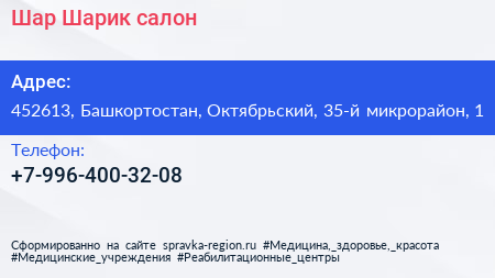 Шар Шарик, салон по адресу 452613, Башкортостан, Октябрьский, 35-й микрорайон, 1 в дальнейшем Организация, размещена в следующих категориях: