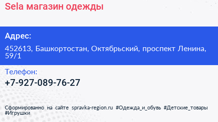 Sela, магазин одежды по адресу 452613, Башкортостан, Октябрьский, проспект Ленина, 59/1 в дальнейшем Организация, размещена в следующих категориях: