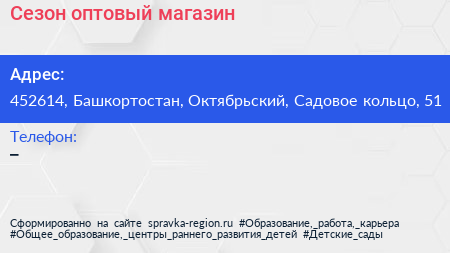 Сезон, оптовый магазин по адресу 452614, Башкортостан, Октябрьский, Садовое кольцо, 51 в дальнейшем Организация, размещена в следующих категориях: