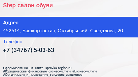 Step, салон обуви по адресу 452614, Башкортостан, Октябрьский, Свердлова, 20 в дальнейшем Организация, размещена в следующих категориях: