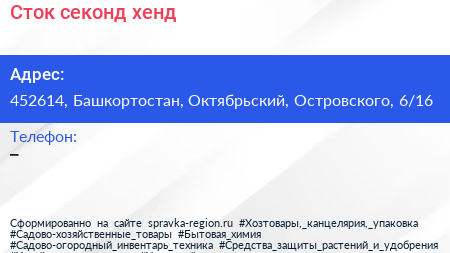 Сток, секонд-хенд по адресу 452614, Башкортостан, Октябрьский, Островского, 6/16 в дальнейшем Организация, размещена в следующих категориях: