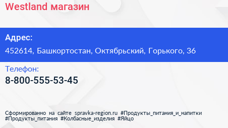 Westland, магазин по адресу 452614, Башкортостан, Октябрьский, Горького, 36 в дальнейшем Организация, размещена в следующих категориях: