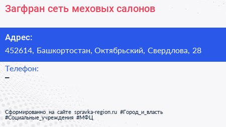 Загфран, сеть меховых салонов по адресу 452614, Башкортостан, Октябрьский, Свердлова, 28 в дальнейшем Организация, размещена в следующих категориях: