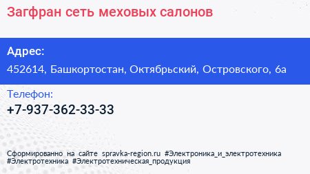 Загфран, сеть меховых салонов по адресу 452614, Башкортостан, Октябрьский, Островского, 6а в дальнейшем Организация, размещена в следующих категориях: