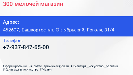 300 мелочей, магазин по адресу 452607, Башкортостан, Октябрьский, Гоголя, 31/4 в дальнейшем Организация, размещена в следующих категориях: