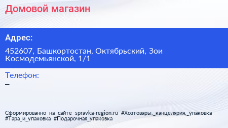 Домовой, магазин по адресу 452607, Башкортостан, Октябрьский, Зои Космодемьянской, 1/1 в дальнейшем Организация, размещена в следующих категориях: