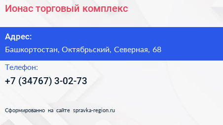 Ионас, торговый комплекс по адресу Башкортостан, Октябрьский, Северная, 68 в дальнейшем Организация, размещена в следующих категориях: