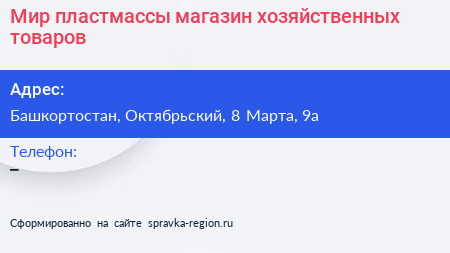 Мир пластмассы, магазин хозяйственных товаров по адресу Башкортостан, Октябрьский, 8 Марта, 9а в дальнейшем Организация, размещена в следующих категориях: