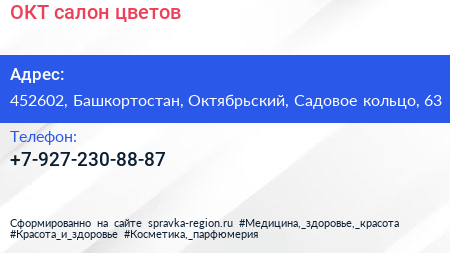 ОКТ, салон цветов по адресу 452602, Башкортостан, Октябрьский, Садовое кольцо, 63 в дальнейшем Организация, размещена в следующих категориях: